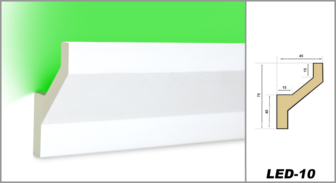 • LED-Profil LED-10, Maße 2000 x 75 x 45 mm, Dichte ca. 220 kg/m³