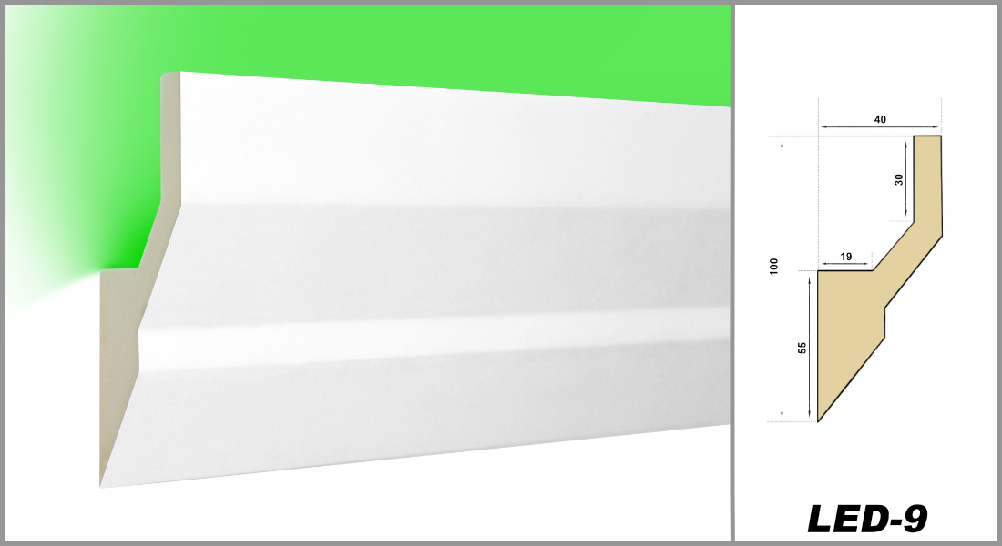 • LED-Profil LED-9, Maße 2000 x 100 x 40 mm, Dichte ca. 220 kg/m³