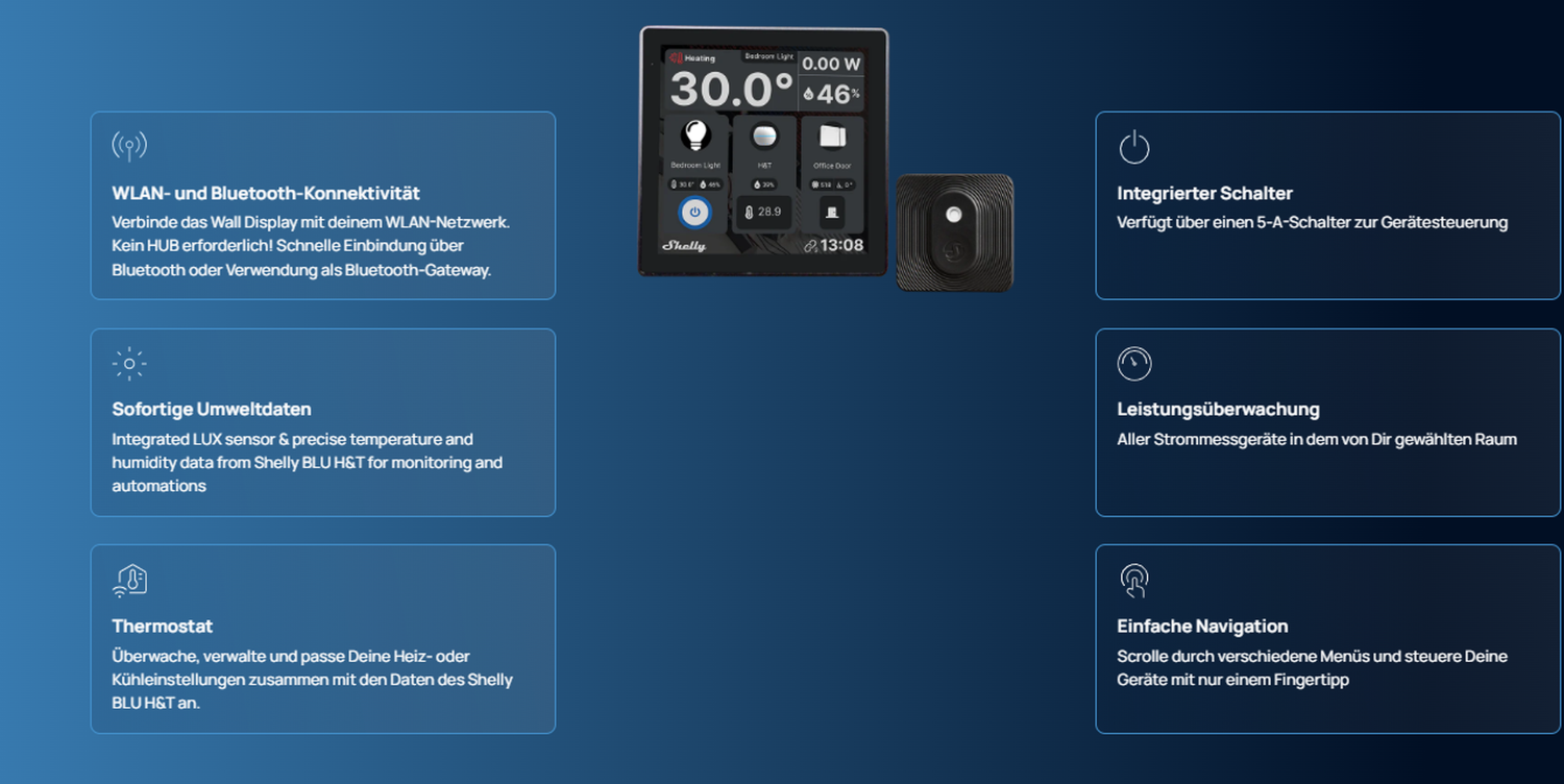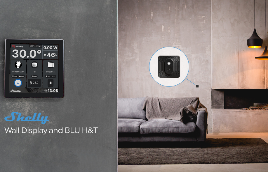 Steuere Deine smarten Geräte mit dem Shelly Wall Display von einem zentralen Ort aus, jetzt in Kombination mit dem Shelly BLU H&T für eine präzise Klimasteuerung.