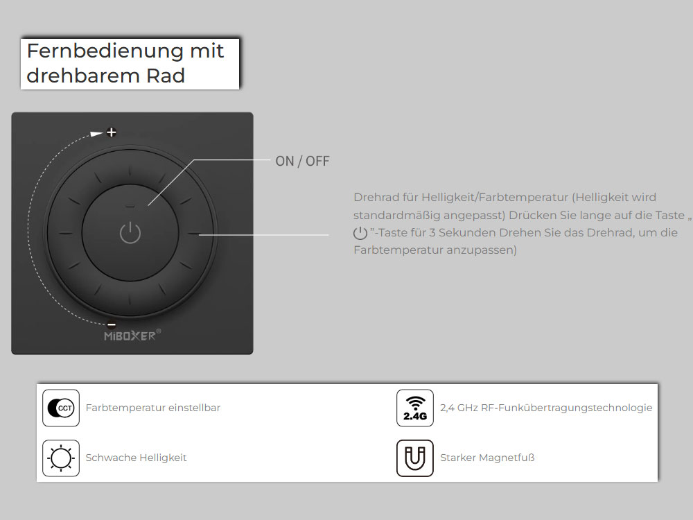 - 2,4G RF-Funkübertragungstechnologie (kann Produkte der MiBoxer/Mi-Light 2.4G-Serie steuern)