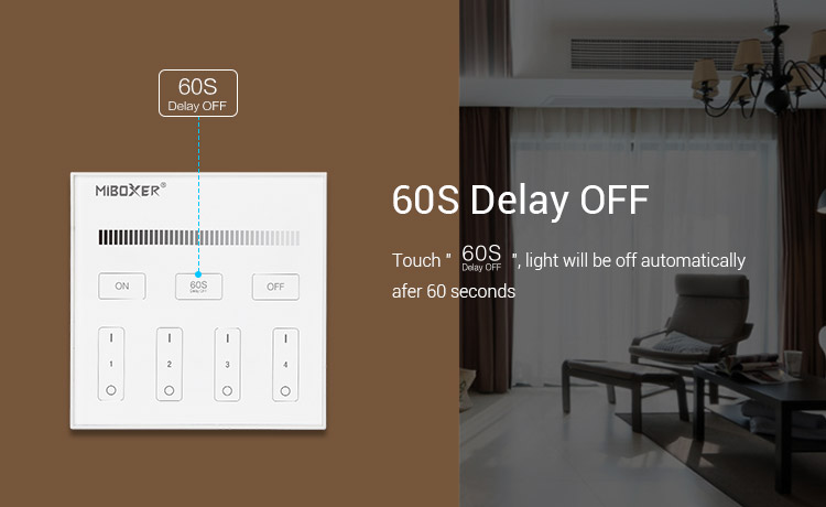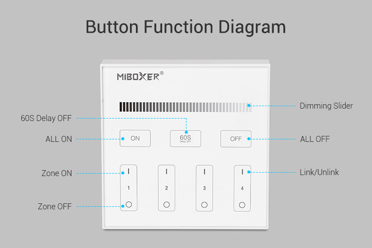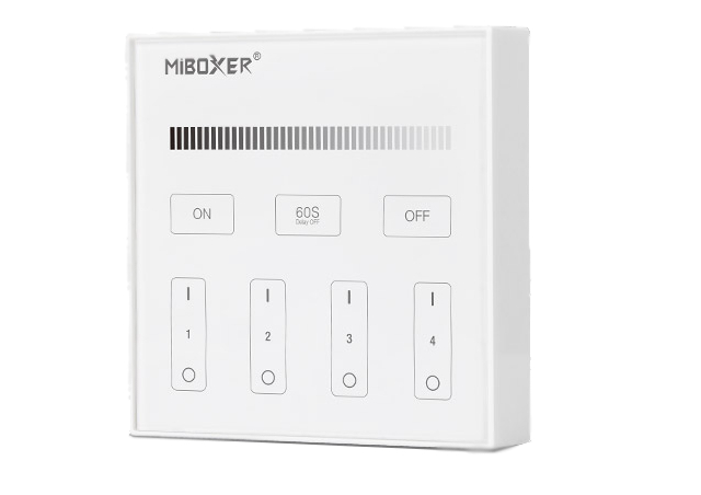 Wandschalter für einfarbige LED Beleuchtung zum einstellen der Helligkeit von 1~100%.Durch diesen 2.4G Wandschalter 4-Kanal MiLight können Sie keine Fernbedienung mehr verlegen und Ihre 2.4G Wifi Produkte direkt steuern. Mit dem 2.4G Wandschalter können mehrere Gruppen von einfarbigen LED Leuchtmittel und Lampen gesteuert werden. Sie können somit mit einer Fernbedienung mehrere Beleuchtungen unterschiedlich oder auch gleichzeitig steuern. Ganz nach Ihrer Belegung/Programmierung der Fernbedienung oder App. Es sind bis zu 4 einzelne Kreise oder auch Gruppen möglich.