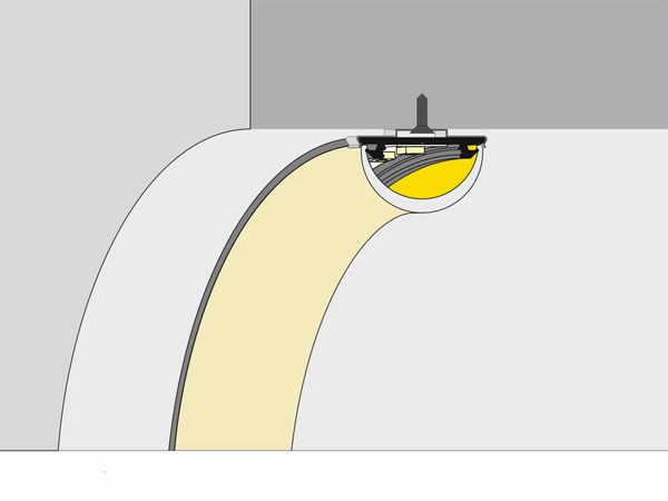 Die halbrunde Abdeckung schmiegt sich in Rundungen und Bögen. Die satinierte Oberfläche ist sehr fein und lässt die Linie im ausgeschalteten Zustand edel wirken.